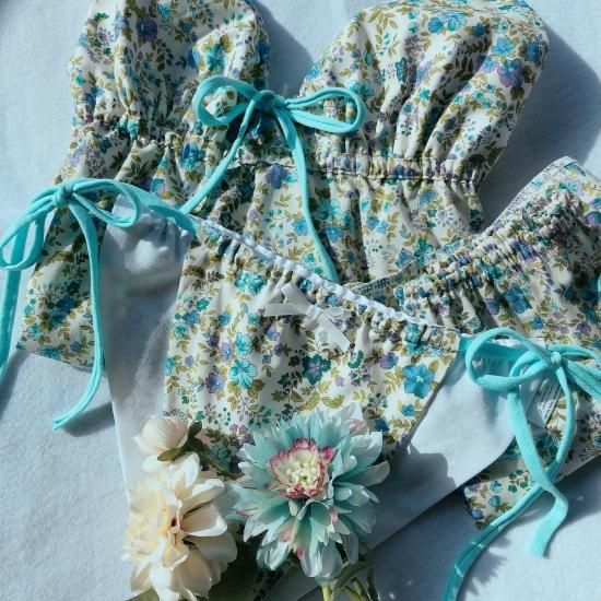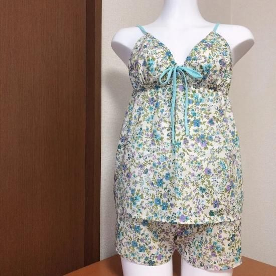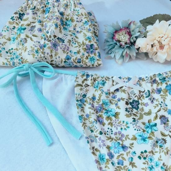 【受注生産】リラックスブラキャミソールとリラックスショーツの2点セット[ブルー系花柄*乙女椿キャミ&桜紐パン]ショートパンツ追加で3点セットも可|はごろもランジェリー