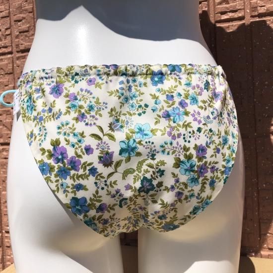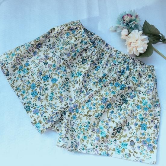 夏に大活躍しそうなブルー系の花柄は年齢を問わず似合う方が多い馴染みやすい色柄を選びました。このような落ち着いた、でも地味すぎない柄は20代から60代以上の方まで幅広く人気があります。なめらかな肌触りの良い上質な薄めのコットン生地(80ローン)なので、つけ心地もとても軽く包まれているようで、体だけでなく気分もふわっと軽くなります。